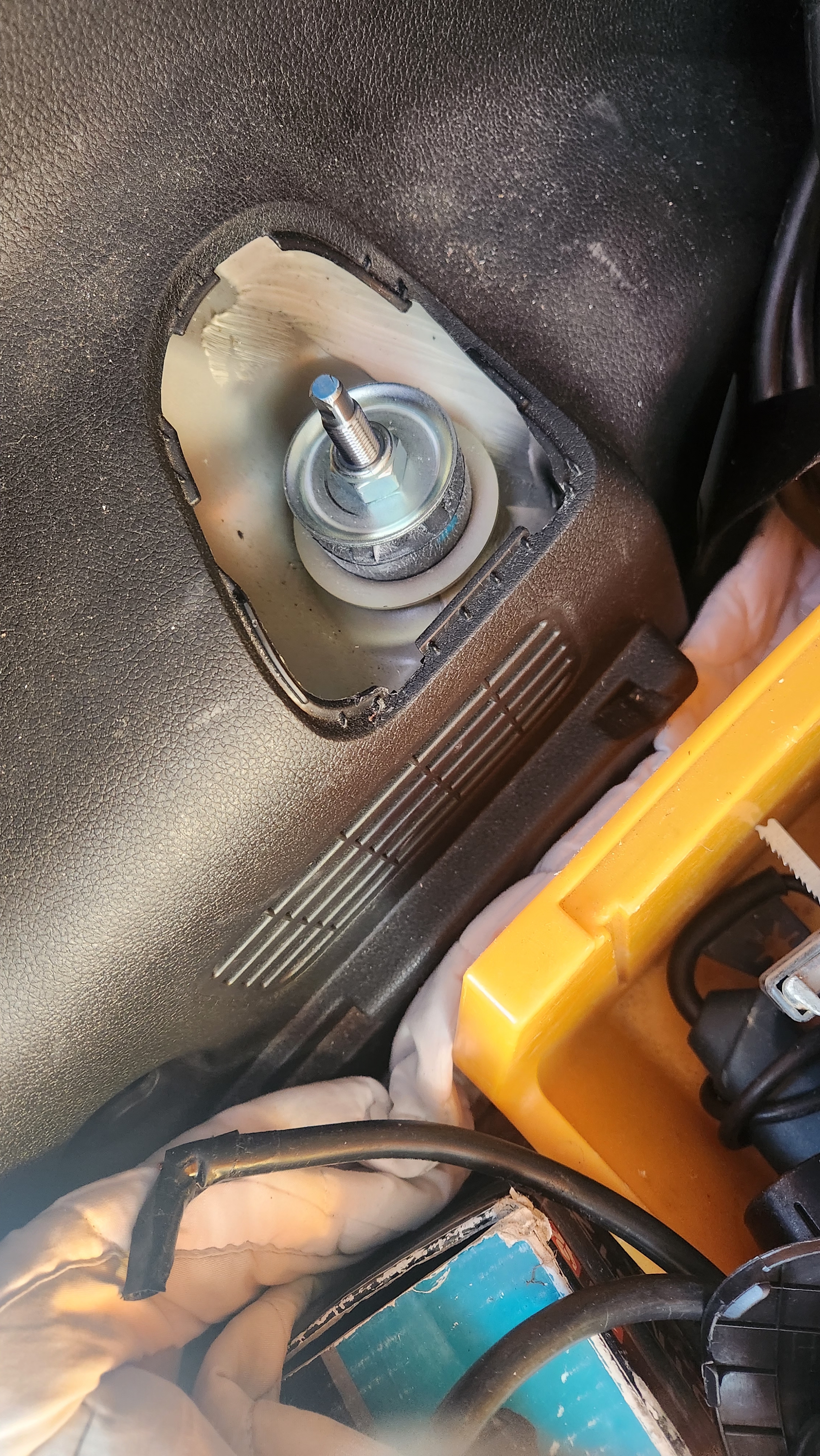 너트를 모두 풀어주고 작키를 이용하여 차체를 들어줍니다. 완전히 들어 올리지 말고 조금씩 들어 올리면서 조금 전 풀어준 볼트가 조금씩 들어가는 것을 확인합니다. 들어가기 시작한다면 들어 올리는 것을 멈춥니다.