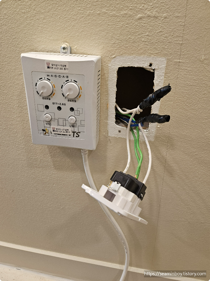 접속및 조립을 마무리하여 테스트 가동을 해봅니다. 전원불 들어오는 것 확인 바닥난방스위치를 사용하여 켜서 전류를 측정하니 6a 정도 나옵니다. 양호한 상태 차단기 고장이 조금은 의심스럽지만 우선 그냥 사용해 보신다고 합니다.