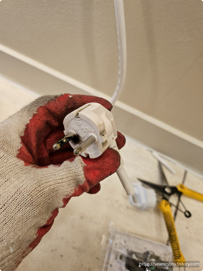열이 발생되어 눌러붙은 플러그를 조립형 플러그로 교체 그리고 콘센트를 새로운 제품으로 교체설치 진행