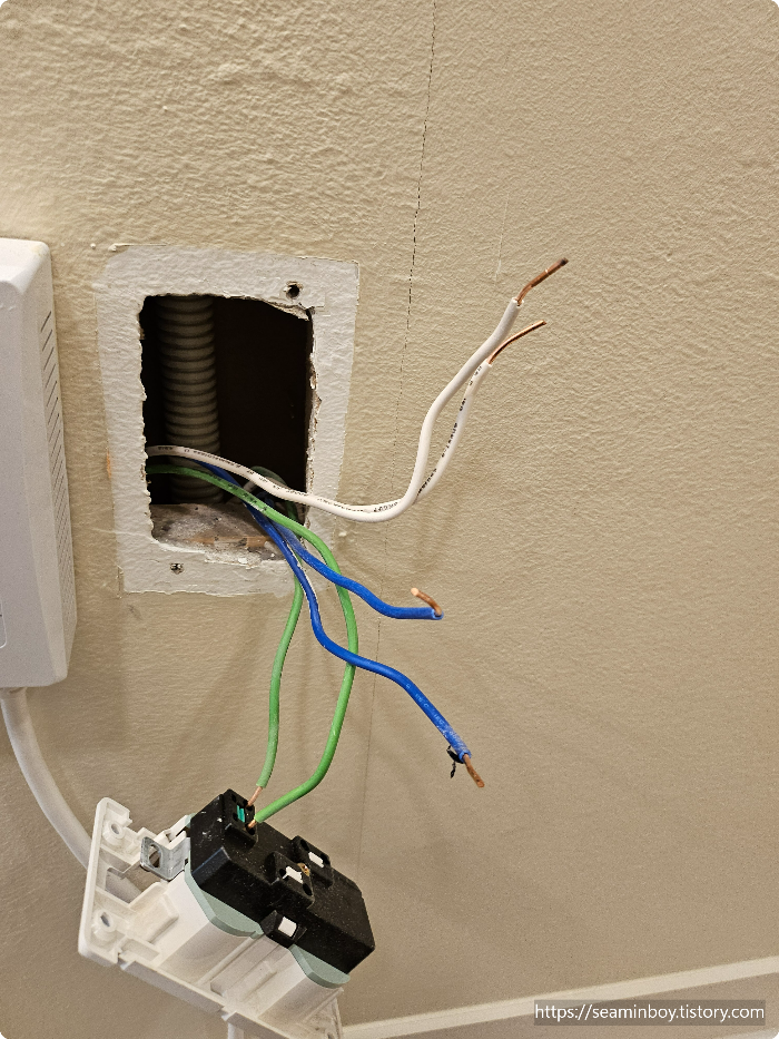 콘센트를 열었을때 전선이 쪼인이 되어있지 않고 콘센트 연결 부분에 그냥 꽂아서 결선이 되어 있는 경우 차후 전선부분이 접촉불량이 발생이 되어 고장 부분이 확산될 수 있으니 쪼인을 하여 결선을 분기하는 방법으로 진행합니다.
