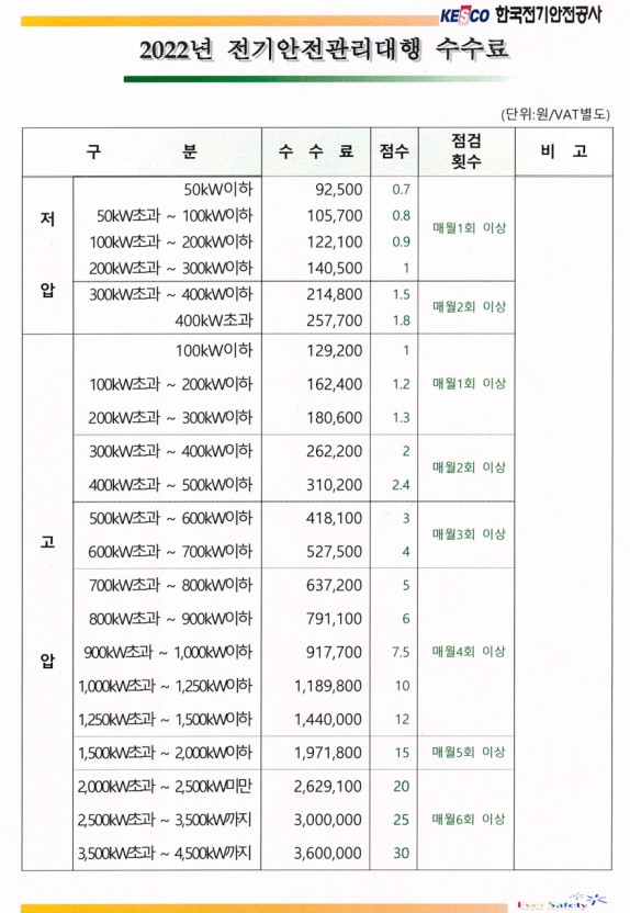 전기안전관리대행이란 22900v~380v를 사용하고 있는 수전설비 중 1000kw 이하 75kw 이상의 전기설비가 설치되어 있는 건축물을 관리하는 비상주 전기안전관리자로 점수에 따라 월 1회에서 6회까지 방문하여 점검을 하는 업무를 이야기합니다. 보통 1회에서 4회 정도이고 5회와 6회가 되는 시설물은 거의 없습니다. 제가 관리하고 있는 시설물도 대부분 1회~ 4회 전기시설물이 있는 건축물입니다.