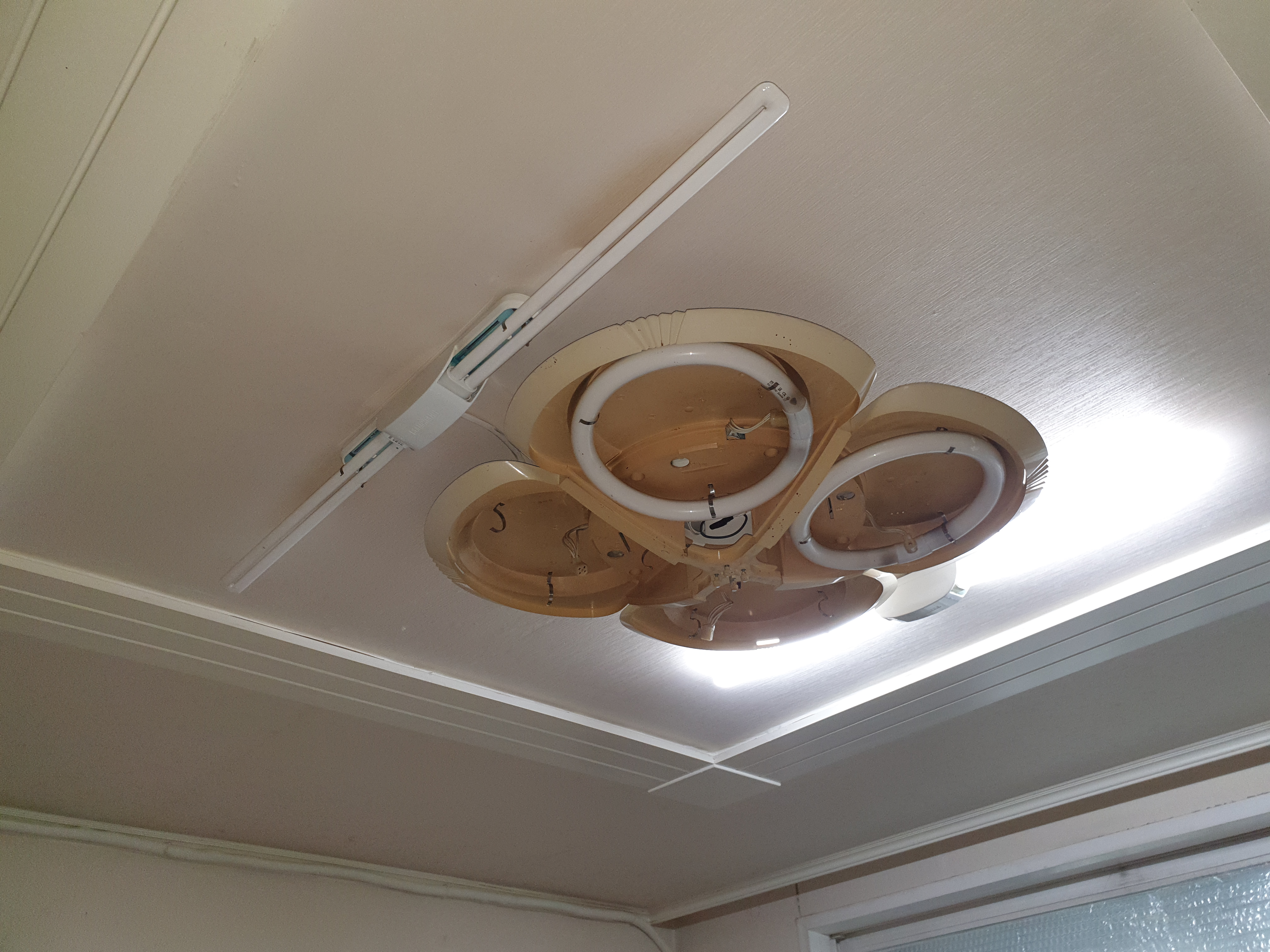 기존전등을 뜯어내고 새로운전등 설치시작합니다. 기존전등도 무게가 어마어마합니다. 옛날등들이 더무겁습니다. 철판이두꺼워. 그렇습니다 요즘나오는 등들은 무게가 그렇게 많이 나가지 않습니다.