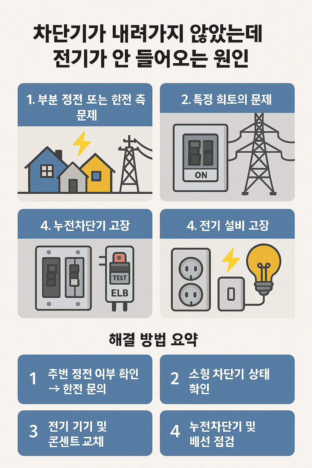 일상에서 갑작스럽게 전기가 들어오지 않으면 당황하기 쉽습니다. 특히 차단기가 내려가지 않았는데도 불구하고 전기가 들어오지 않는 상황이라면 더욱 원인을 파악하기 어렵습니다. 이 글에서는 그런 경우의 주요 원인과 해결 방법을 소개합니다.