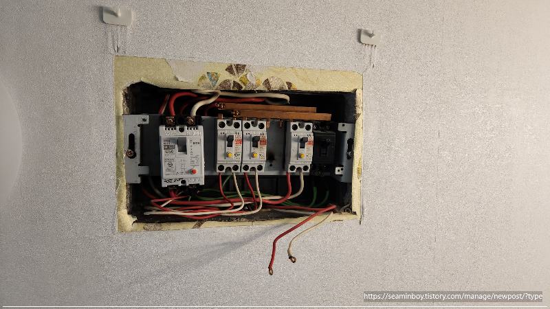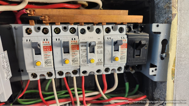 인테리어 업체에서 모두 30a로 설치를 해두어서 우선 교체하는 차단기는 20a로 설치하였습니다. 전선의 굵기가 2.5 스퀘어여서 30a설치는 불가하고 20a만 설치가 가능합니다. 나머지 차단기는 차후 교환하신다고 합니다.