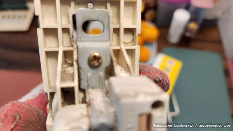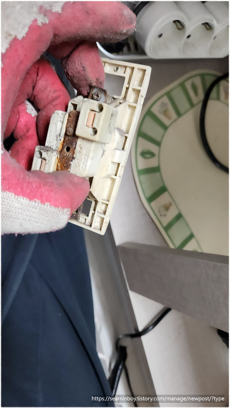 방문도착을 하여 제일 먼저 분전함의 차단기 부분을 확인 누전수리를 확인하여 문제점을 추적합니다. 콘센트들을 철거해 가면서 작업을 합니다. 주방아래쪽에 콘센트를 철거하여 확인을 하니 콘센트 상태가 좋지 않습니다.. 습기가 결로로 인하여 장시간 시간이 흘러 콘센트에 녹이 많이 슬었습니다. 녹은 만이 슬었지만 누전상태는 아니기에 다시 작업을 진행합니다.